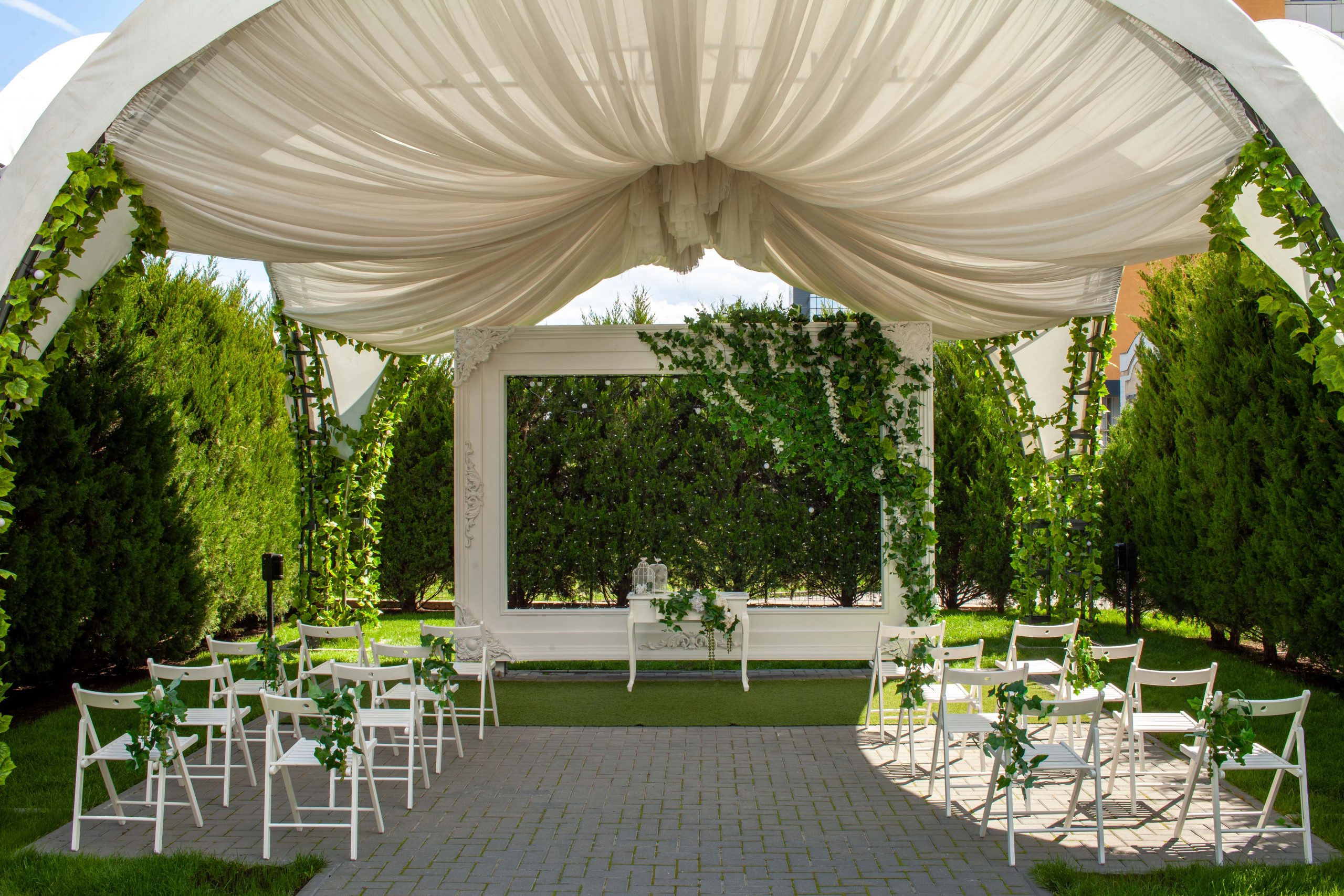 Un mare avantaj al restaurantului îl prezintă terasele laterale, ce se atribuie sălilor Neoclasic și Fusion. Prezintă o zonă verde amenajată, intimă datorită tuielor de pe tot perimetrul terasei și a cupolelor ce o acoperă. Locul perfect pentru zona de întâmpinare a oaspeților, înscrierea căsătoriei, sesiuni foto și relaxare în perioada evenimentului vibrant la maxim.