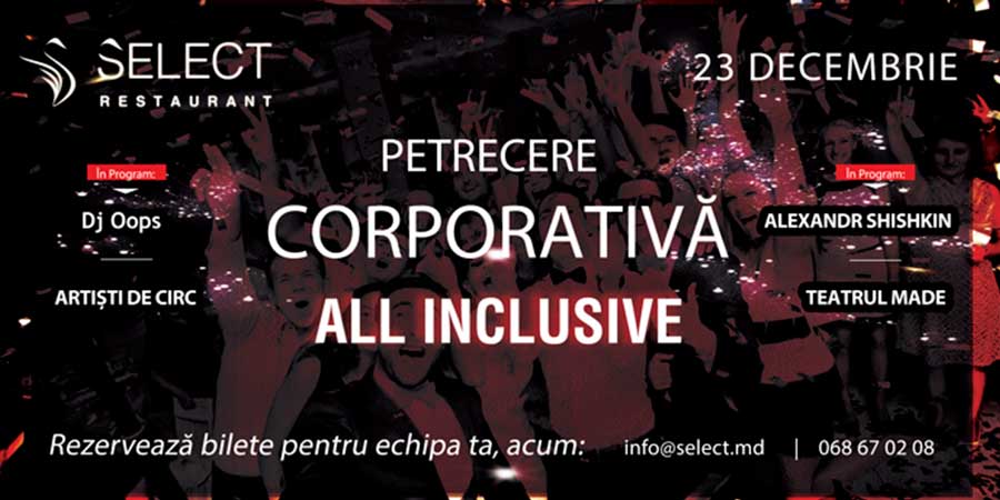 Pe data de 23 decembre, în sala de banchet Neoclasic, a Restaurantului Select, va fi organizată o petrecere corprativă mixtă, la care sunt invitate toate colectivele care-și doresc o sărbătoare selectă.