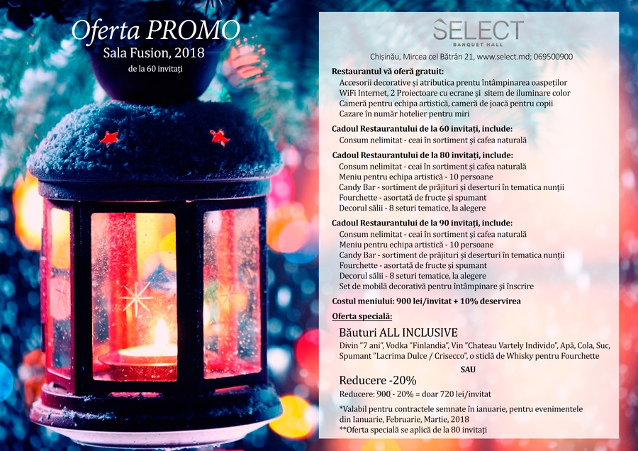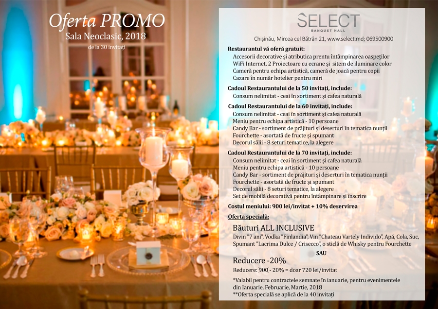 Doar pentru acei care planifică să sărbătorească o ocazie specială în perioada Ianuarie – Martie 2018, Restaurantul Select pune la dispoziție o ofertă fără precedent. Fie că vă doriți o nuntă, cumătrie, zi de naștere sau oricare alt banchet în acest interval – primiți cadou bonusul maximal pentru petrecerea Dumneavoastră și pe lângă asta, Reducere -20 % sau absolut toate băuturile la eveniment – GRATUIT!